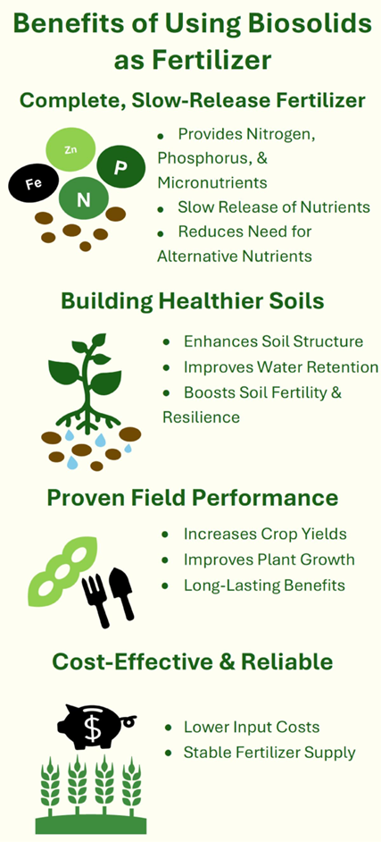 Summary Used responsibly, biosolids provide farmers with a practical, science‑based way to lower fertilizer costs, build healthier soils, maintain or increase yields, and reduce exposure to volatile global markets. For many operations, they serve as an effective and environmentally responsible alternative or complement to conventional fertilizers.